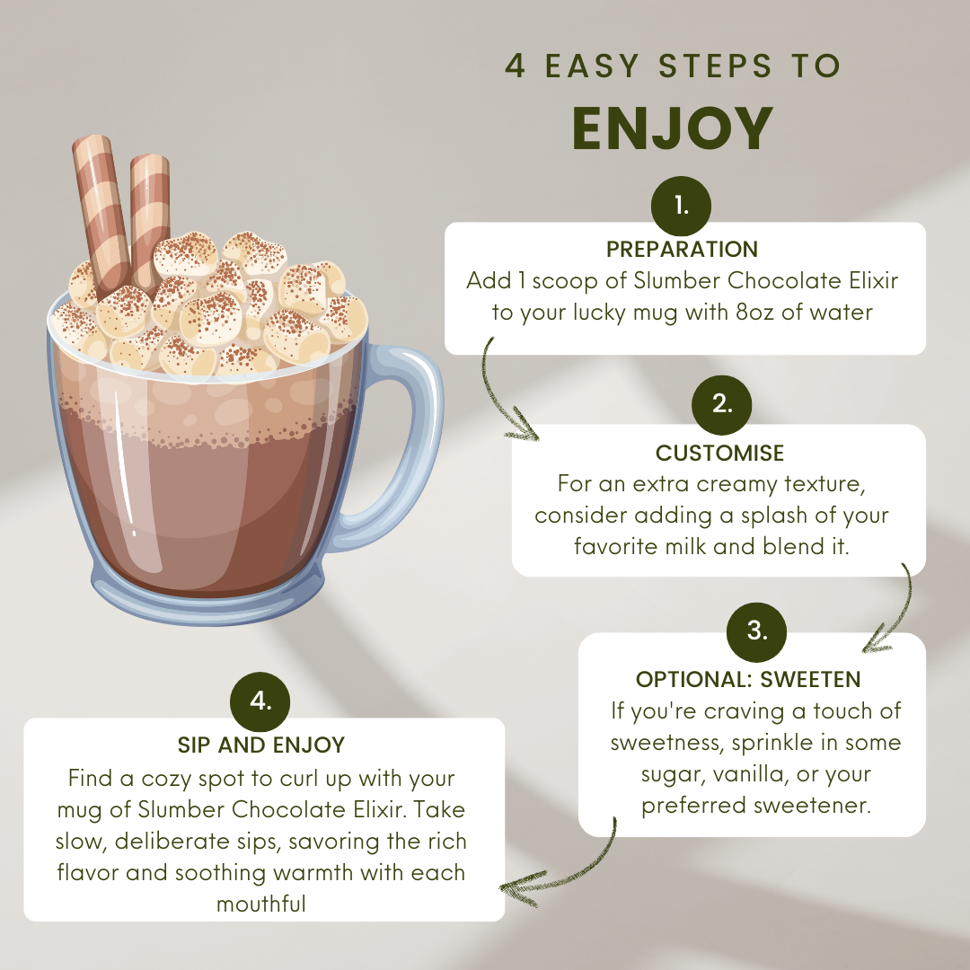 As you sip your Slumber Chocolate Elixir, close your eyes and take a deep breath. Feel the warmth of the cup in your hands and the comforting aroma that surrounds you.